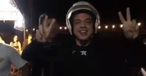 Para não chegar atrasado, o artista pegou carona numa moto da Guarda Municipal.