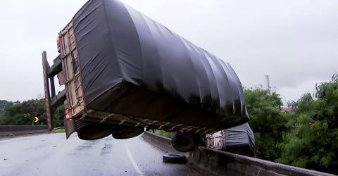 Carreta colide na traseira do carro parada na rodovia e fica pendurada em alça de acesso