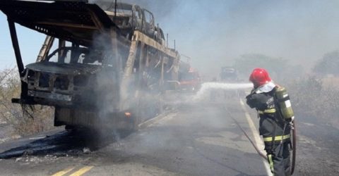 De acordo com informações da Polícia Militar, o motorista saiu ileso do incêndio e contou que o fogo começou quando uma das rodas do veículo travou de repente