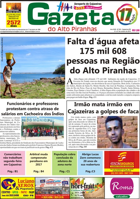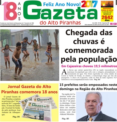 O jornal Gazeta do Alto Piranhas circula todas as sextas-feiras, na cidade de Cajazeiras e região, para assinar ou comprar: (83) 3531-1535 Leia mais notícias no www.diariodosertao.com.br, siga nas redes sociais: Facebook, Twitter, Instagram e veja nossos vídeos no Play Diário. Envie informações à Redação pelo WhatsApp (83) 99157-2802.
