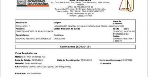 Júnior Araújo comemorou aniversário na quinta-feira (26) e realizou a coleta no Hospital Regional de Cajazeiras no sábado, dia 21 de março, após queixar-se de sintomas gripais
