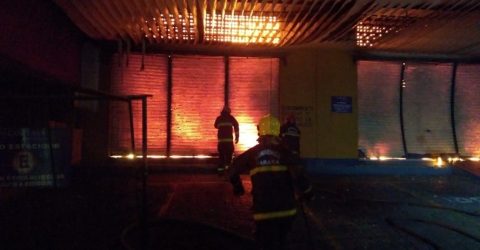 Para resfriar o estabelecimento, o Corpo de Bombeiros precisou arrombar tanto a grade de proteção da loja quanto a porta principal.