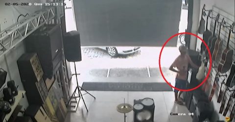 Câmeras internas flagraram um indivíduo entrando na loja tranquilamente e pegando um violão