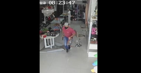 Câmera de segurança dentro do estabelecimento registra o momento em que um homem com boné, máscara e camisa vermelha saca uma arma e rouba mulher