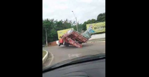 O acidente aconteceu na rotatória que dá acesso ao bairro Santa Delmira, em Mossoró (RN). A internauta que flagrou o tombo vinha em um carro logo atrás do caminhão