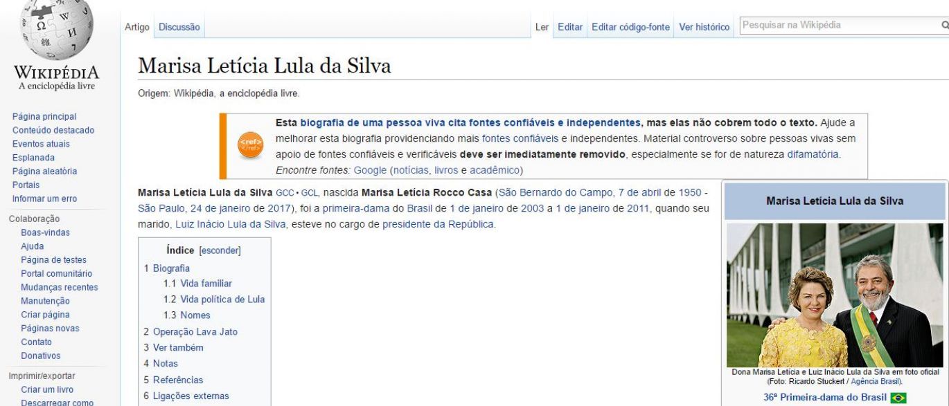 No site constava que ex-primeira-dama havia nascido dia 7 de abril de 1950 e morrido em 24 de janeiro de 2017