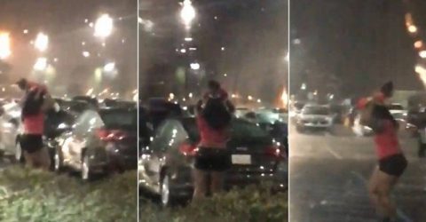 Uma mulher foi vista usando uma criança - possivelmente filha dela - como guarda-chuva durante temporal na cidade.