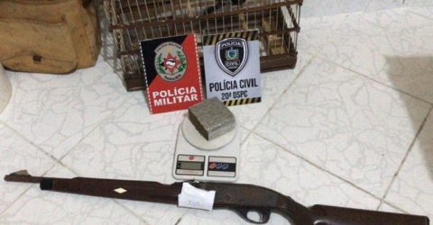 Com o suspeito foram apreendidos tabletes de maconha, uma espingarda e uma grande quantidade de pássaros