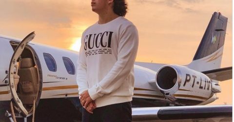 Além da aeronave, Whindersson mandou ver no look do dia: blusa da Gucci e um tênis dourado