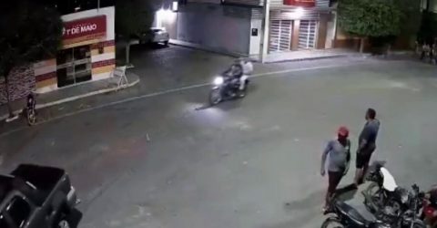 As imagens revelam o acusado chegando na garupa de uma moto, puxando a arma da cintura e atirando em direção ao torcedor palmeirense
