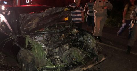 De acordo com primeiras informações repassadas pelo Corpo de Bombeiros, carro bateu com violência na traseira da caminhonete que estava transportando capim