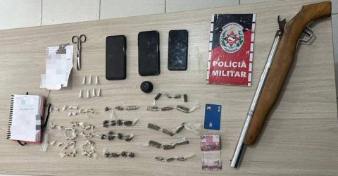 Além das drogas, a polícia apreendeu uma arma artesanal de calibre 12, aparelhos celulares e um caderno contendo anotações e material de contabilidade que indicam a movimentação do tráfico na região