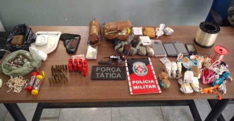 Com a dupla, os policiais encontraram uma pistola com dois carregadores e munições, balança de precisão, porções de entorpecentes, celulares, dinheiro em espécie e uma máscara.