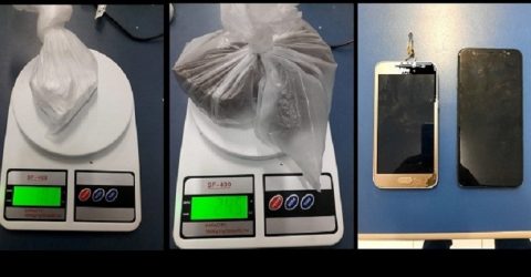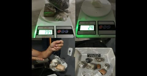 Havia dentro do pacote, 416 gramas de uma substância semelhante à maconha e 81 gramas semelhante à cocaína, além de dois chips e um carregador de celular