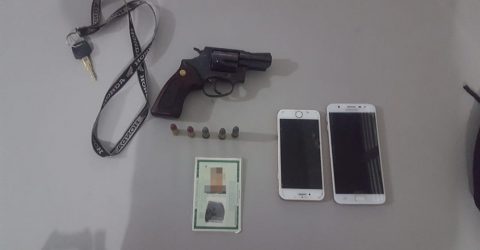 Na abordagem foi encontrado um revólver cal 38, com 5 munições intactas e os celulares roubados no estabelecimento comercial.