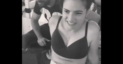 Lais Souza mexe os ombros apoiada nas próprias mãos; vídeo