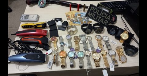 Dentro da residência do suspeito foram encontrados vários objetos com origem ilícita, dentre eles inúmeros relógios, inclusive ainda com as etiquetas da loja e uma espingarda calibre 12