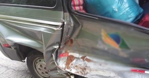 O veículo teve uma de suas portas completamente destruídas, com a força do impacto em que a pedra deslizou e rolou para a rodovia.