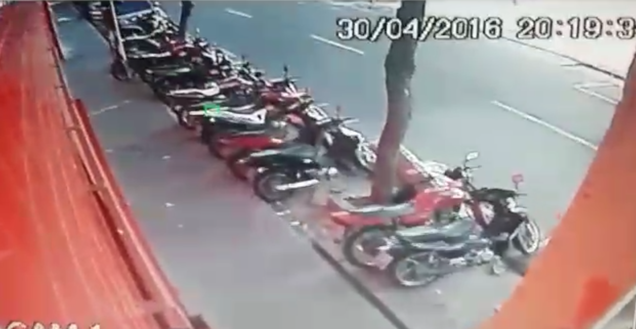 De acordo com informações da polícia militar, dois homens em uma moto de cor vermelha portavam uma arma de brinquedo. Veja!