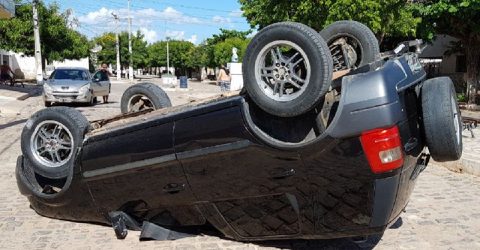 O veículo que estava ocupado somente pelo motorista ficou com as rodas para o alto.