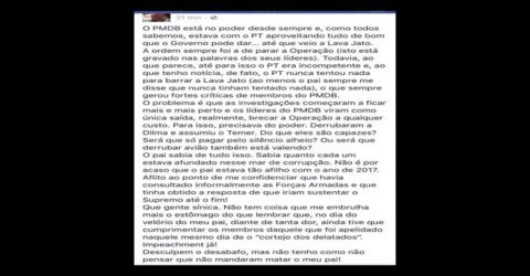 A publicação foi feita logo após a divulgação das delações e apagada em seguida, mas foi copiada por internautas.