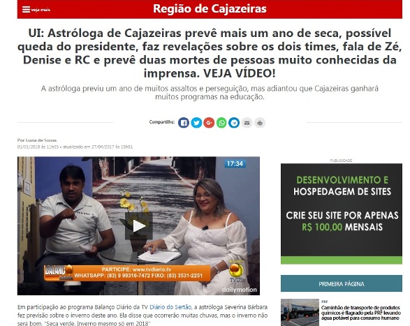 A astróloga cajazeirense, Severina Bárbara, em suas previsões exclusivas para a TV Diário do Sertão sobre o ano de 2017, previu a possível morte do jornalista.