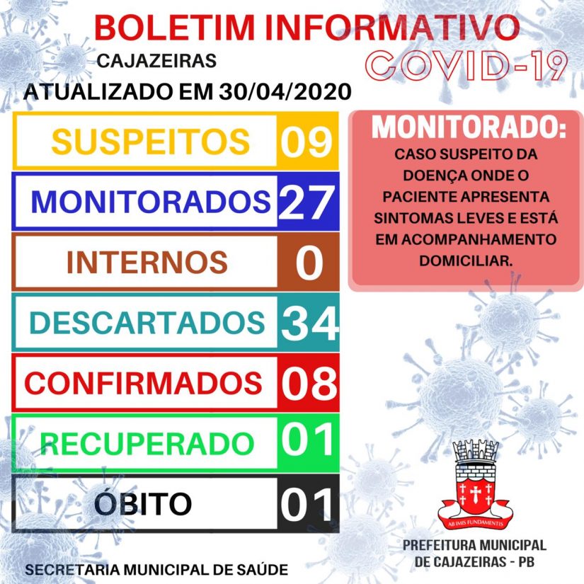 No momento, de acordo com o boletim epidemiológico desta quinta, Cajazeiras tem 8 casos confirmados, 34 casos descartados, 9 casos em análise (aguardando resulta dos exames), 1 caso recuperado, 1 óbito, nenhum internado e 27 pessoas em monitoramento (que tiveram contato com casos confirmados).