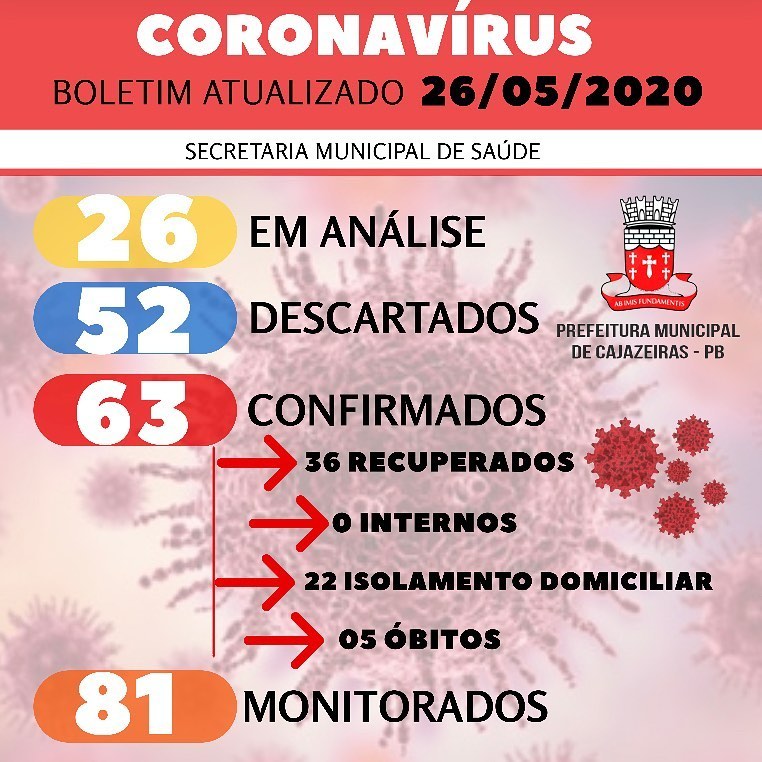 Conforme o boletim de hoje, Cajazeiras tem 26 casos em análise, 52 descartados, 63 confirmados (36 recuperados, 0 internos, 22 em isolamento domiciliar, 5 óbitos) e 81 casos monitorados.