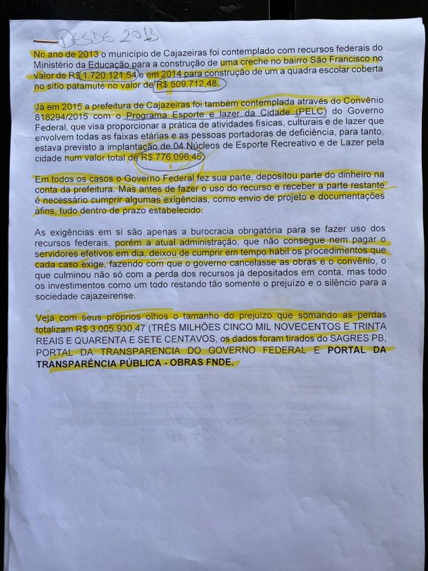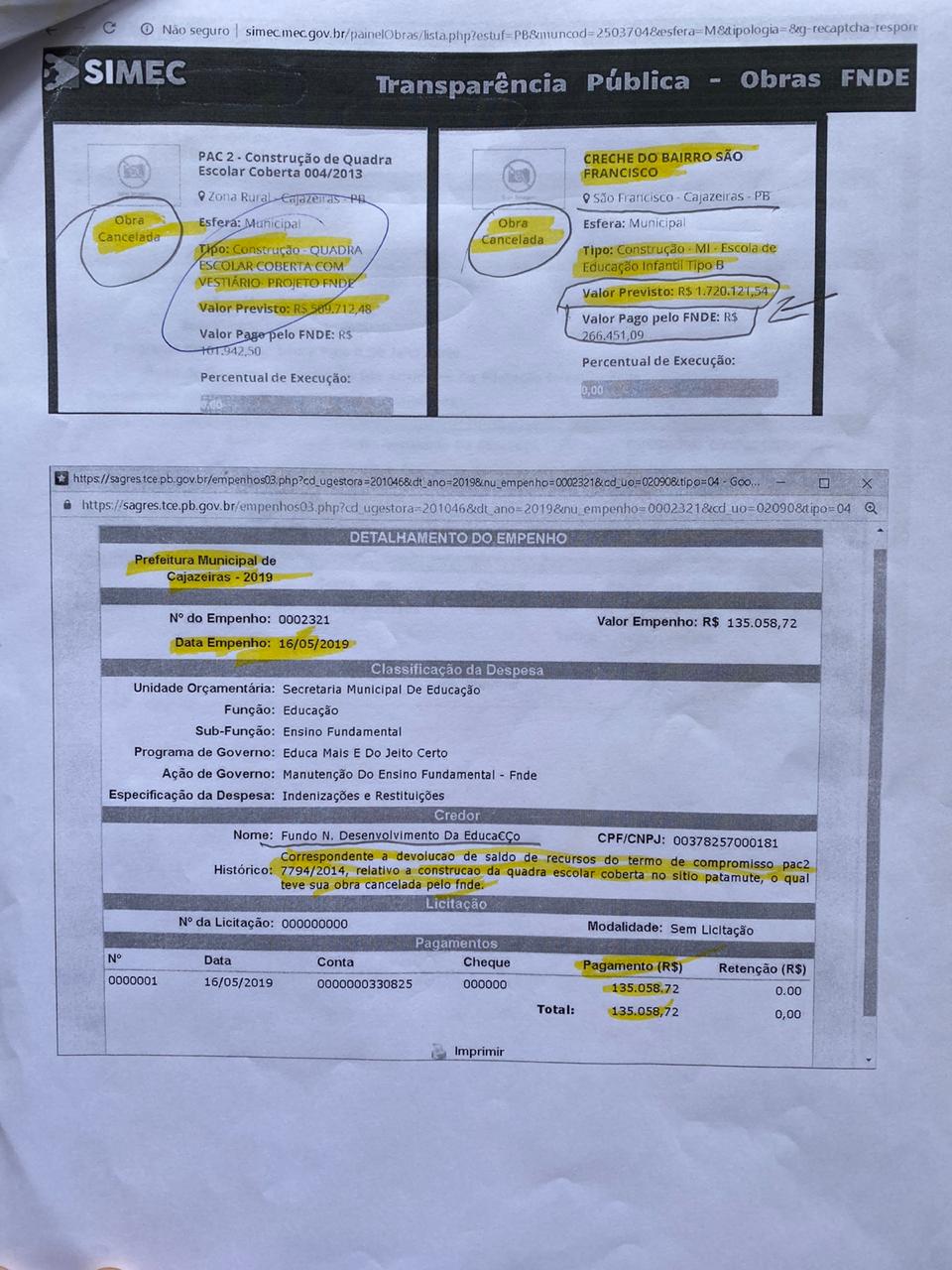 Durante participação em um programa de rádio de Cajazeiras, o pré-candidato a prefeito Marquinhos Campos apresentou documentos que, segundo ele, provam que a gestão do prefeito José Aldemir (PP) deixou retornar verbas que deveriam ser utilizadas em obras importantes de educação e esporte (os documentos estão no final dessa matéria).