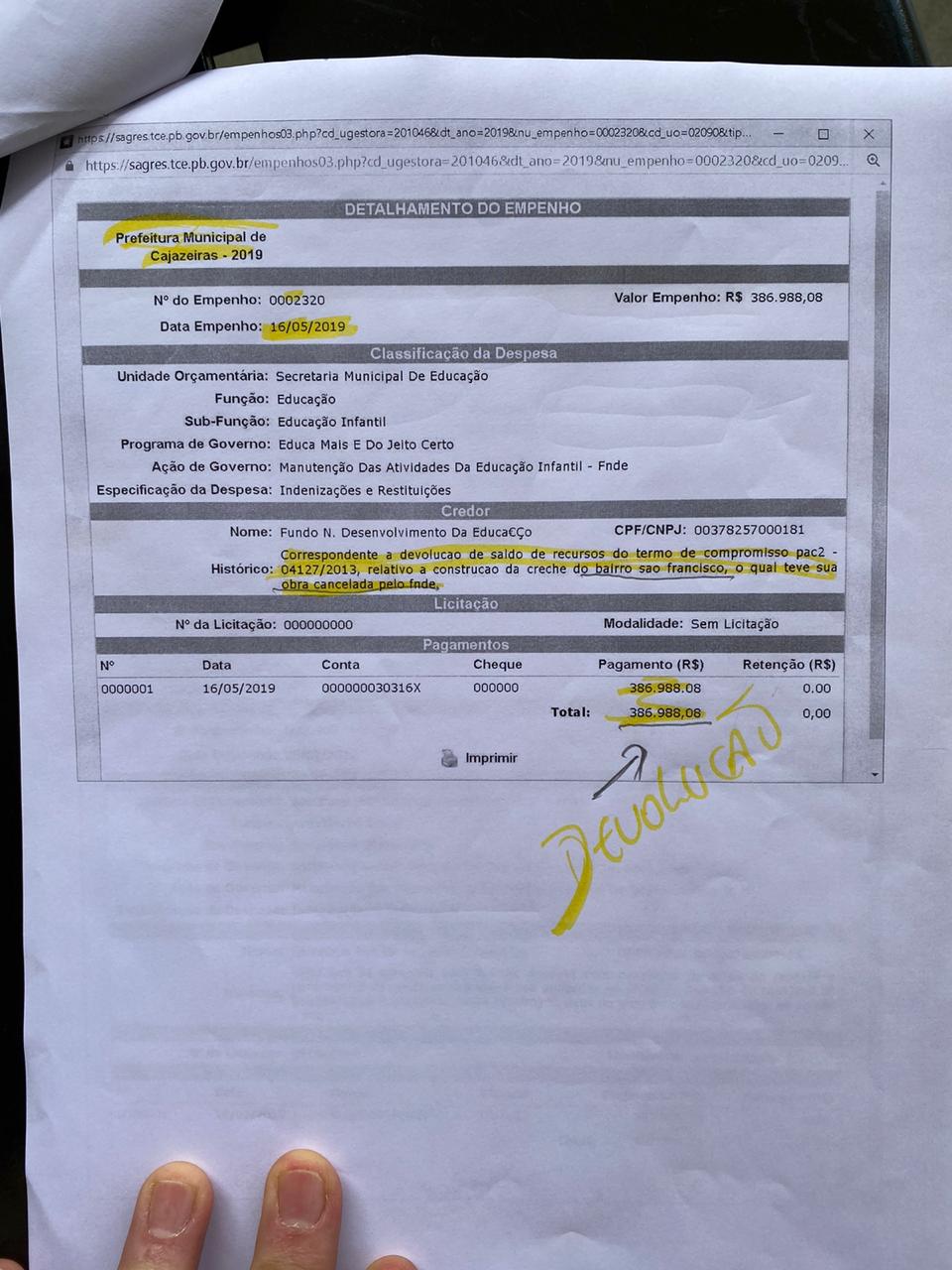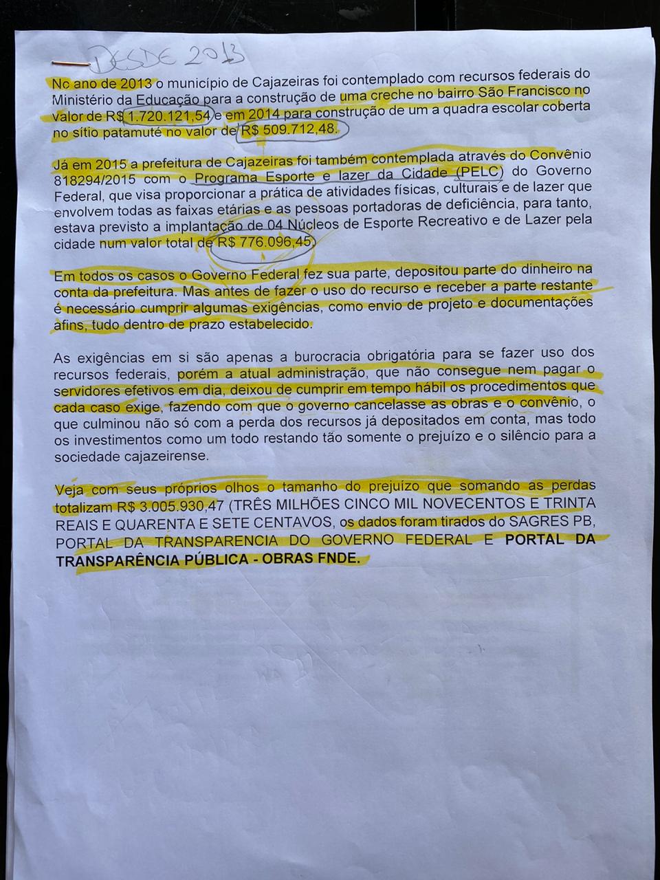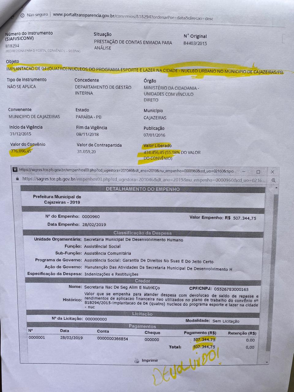 O ex-secretário de Esportes de Cajazeiras, Adjailson Bezerra, o Ninha, disse ao Diário do Sertão que o referido recurso para a construção de espaços públicos de esporte e lazer era oriundo do Programa Esporte e Lazer da Cidade (PELC), desenvolvido pela Secretaria Nacional de Esporte, Educação, Lazer e Inclusão Social (Snelis). Porém, segundo ele, estava sob a responsabilidade da Secretaria de Educação de Cajazeiras.