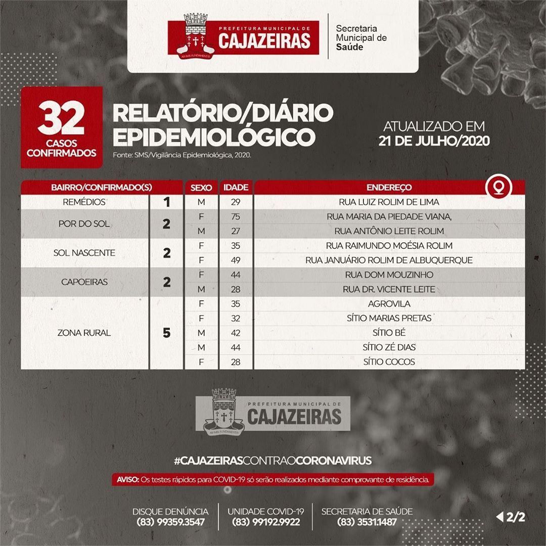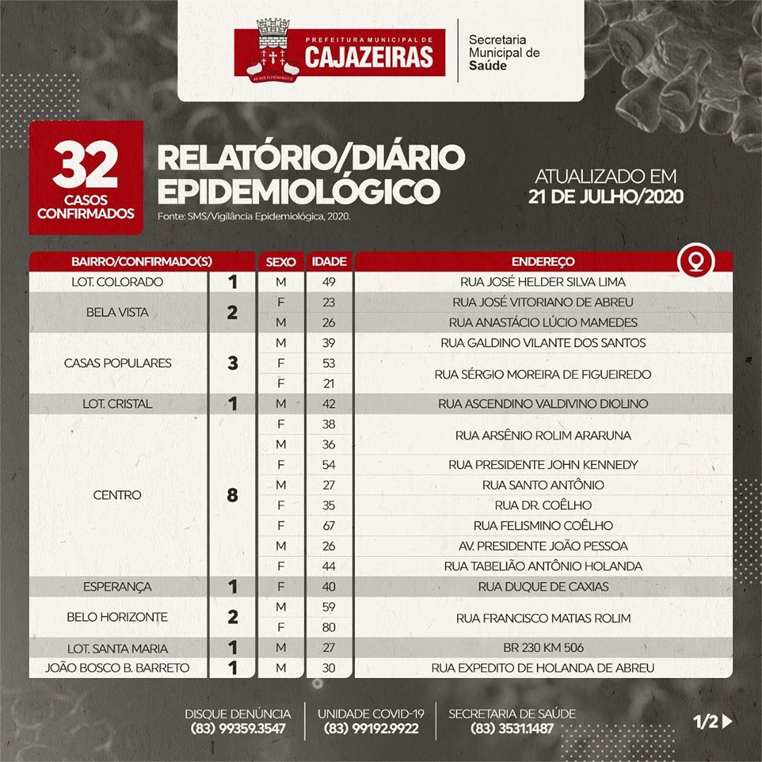 De acordo com o boletim epidemiológico da Secretaria de Saúde de Cajazeiras, emitido nesta terça-feira (21), o município registrou mais 32 casos confirmados de Covid-19 nas últimas 24 horas. Um dado novo é que durante a live de divulgação do boletim, a secretária de Saúde Francimones Albuquerque também informou que os profissionais da Atenção Primária de Saúde do município diagnosticaram 14 casos de Hanseníase.