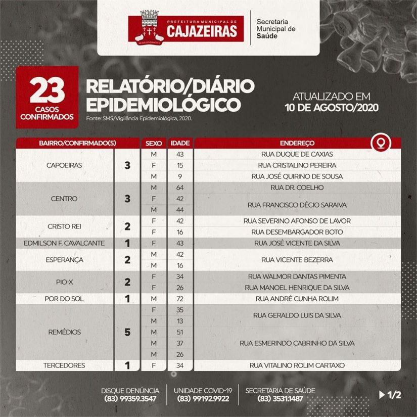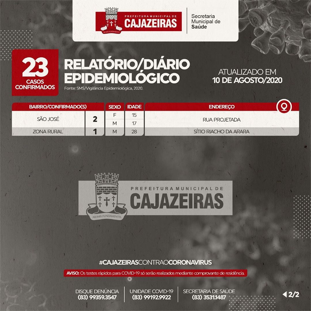 A Secretaria de Saúde de Cajazeiras registrou 23 casos confirmados de Covid-19 nesta segunda-feira (10), de acordo com o boletim epidemiológico do dia.
